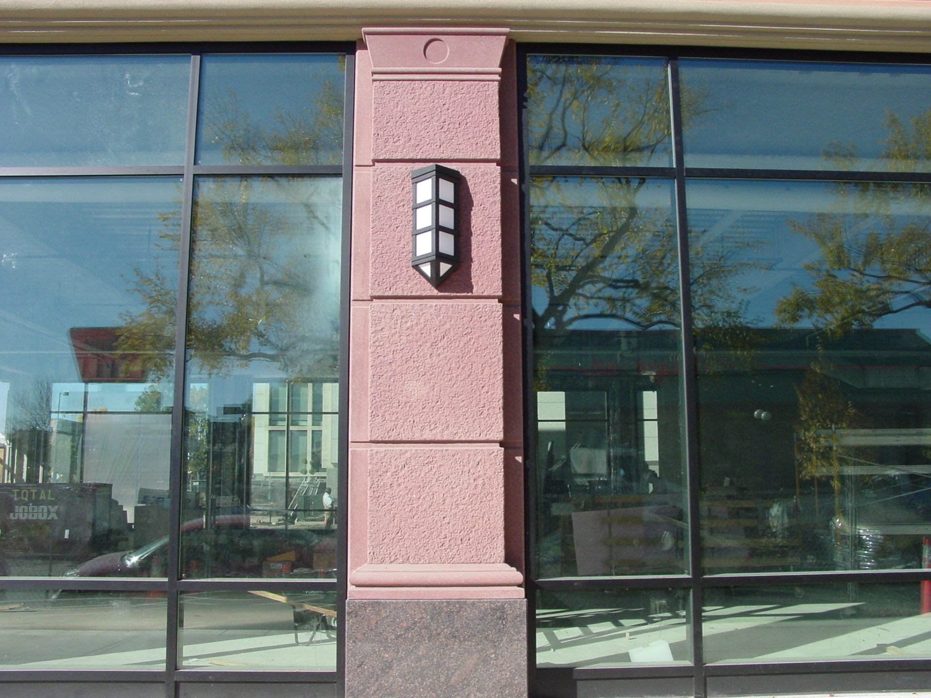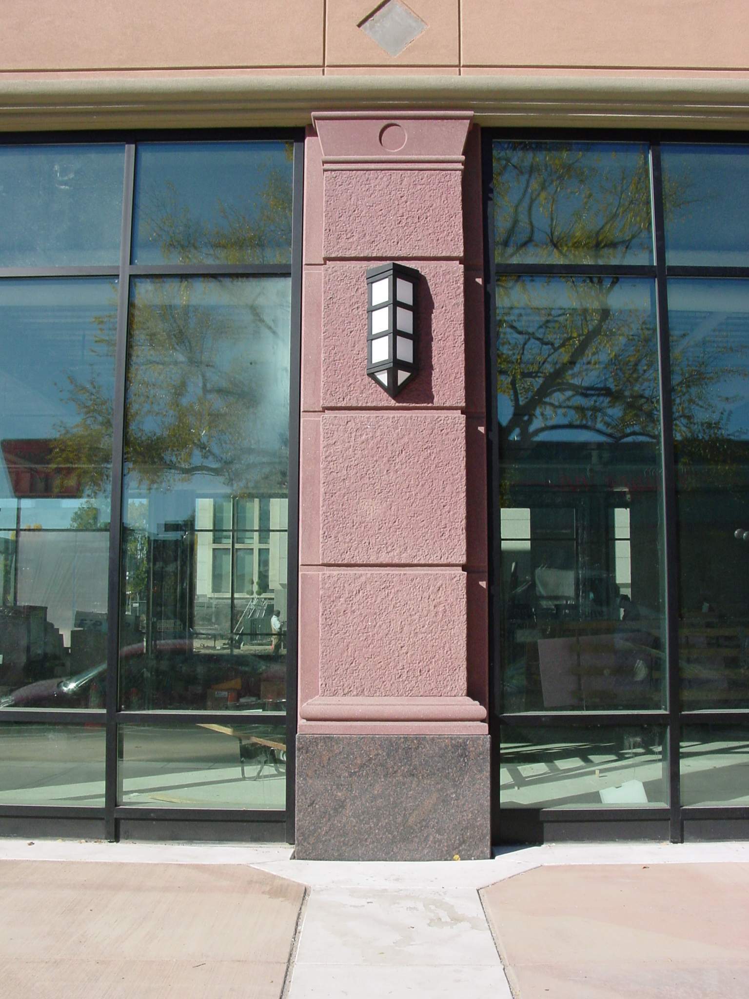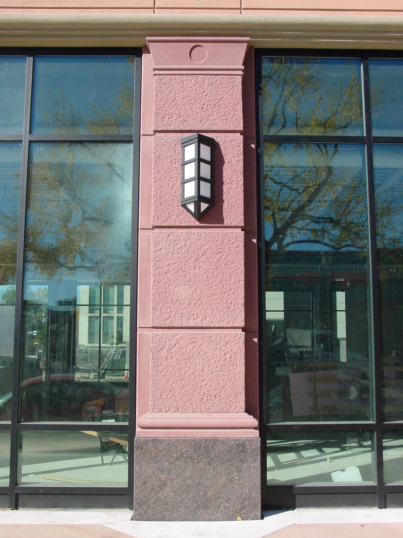 Detailed faux pilasters with a cornice above them that wraps around the building. Complimented by white concrete balustrades with base and railing cap on the second floor at a Juliet balcony.
