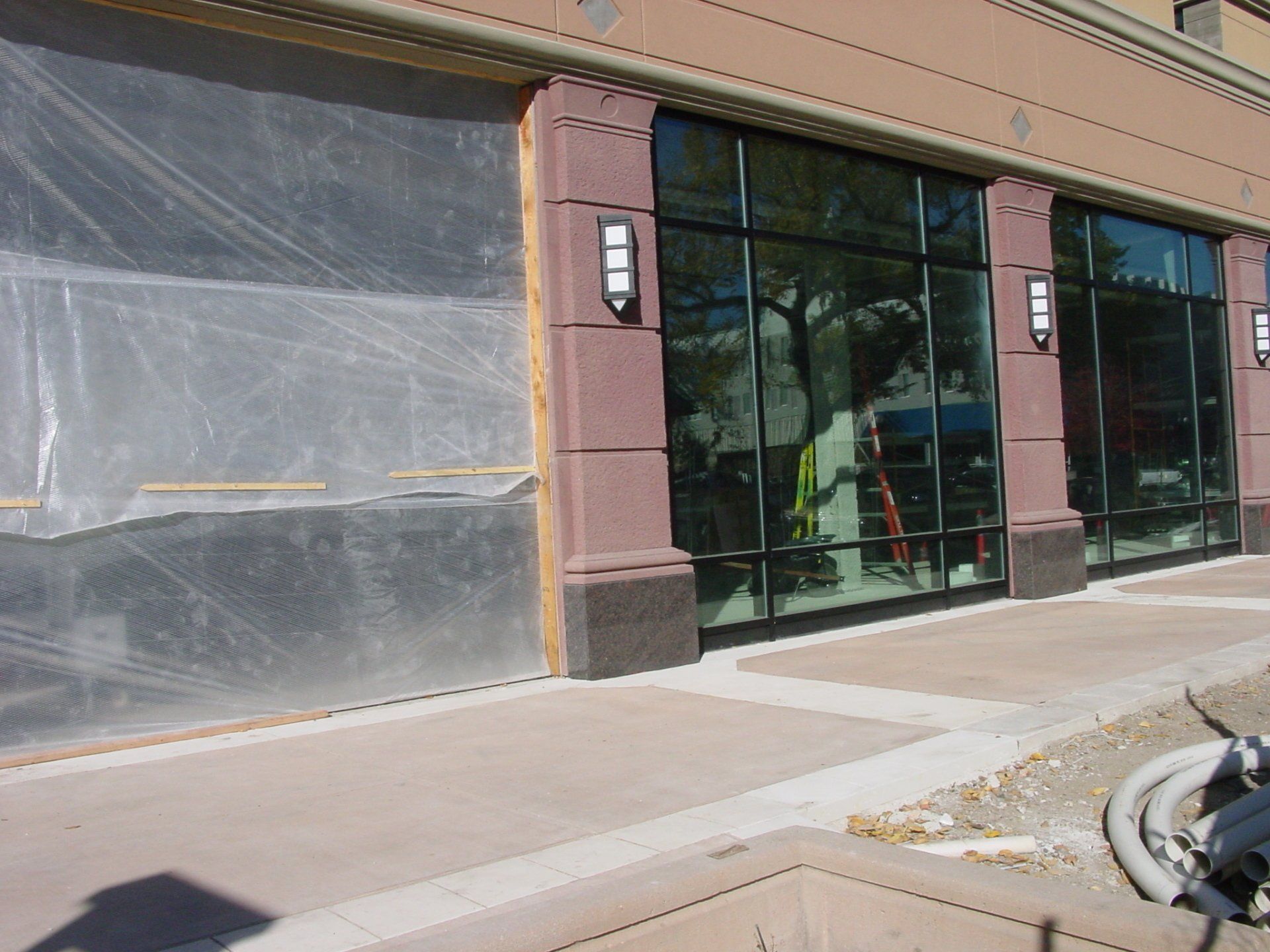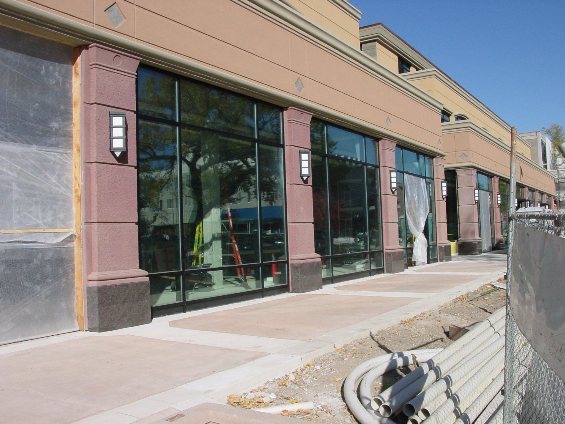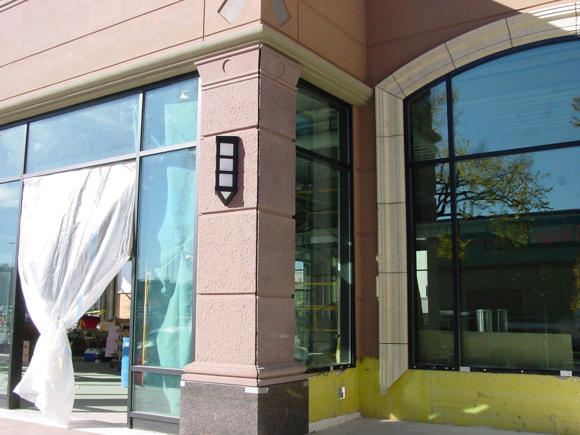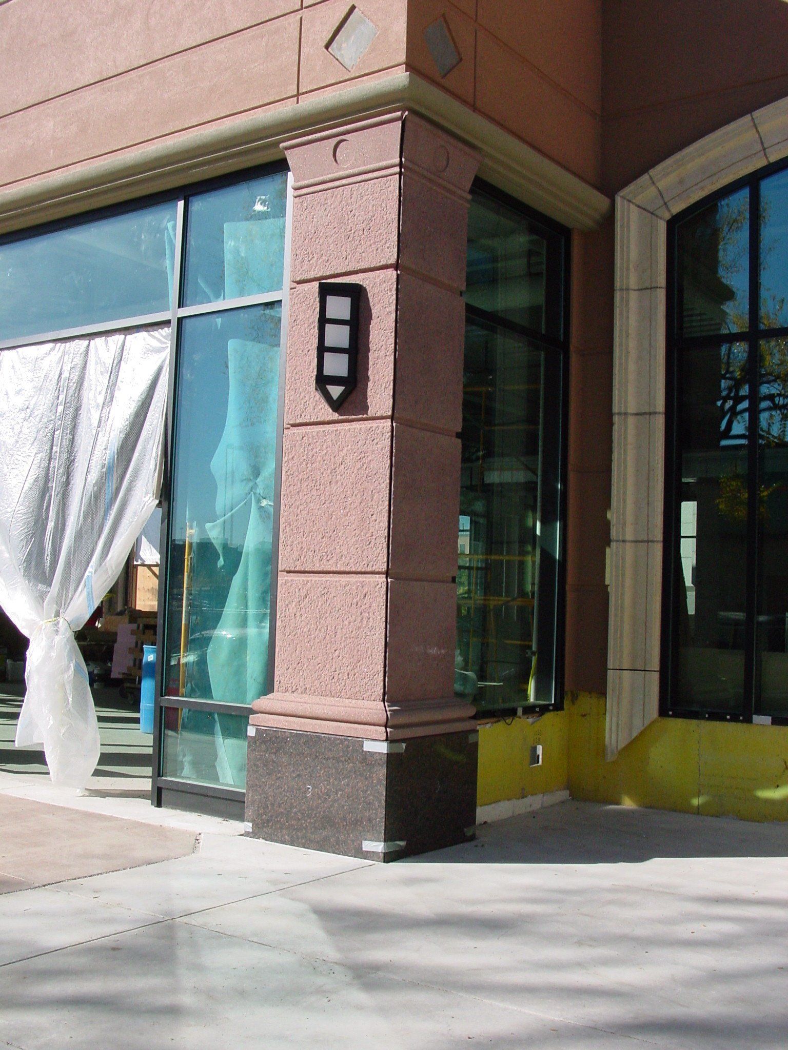 Detailed faux pilasters with a cornice above them that wraps around the building. Complimented by white concrete balustrades with base and railing cap on the second floor at a Juliet balcony.