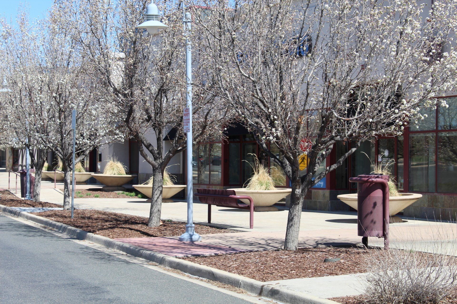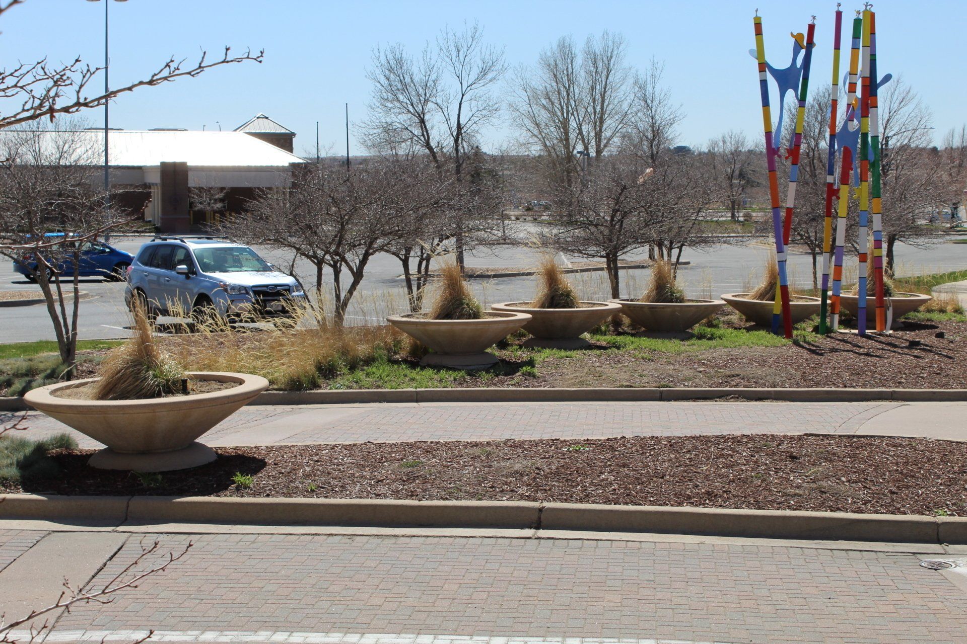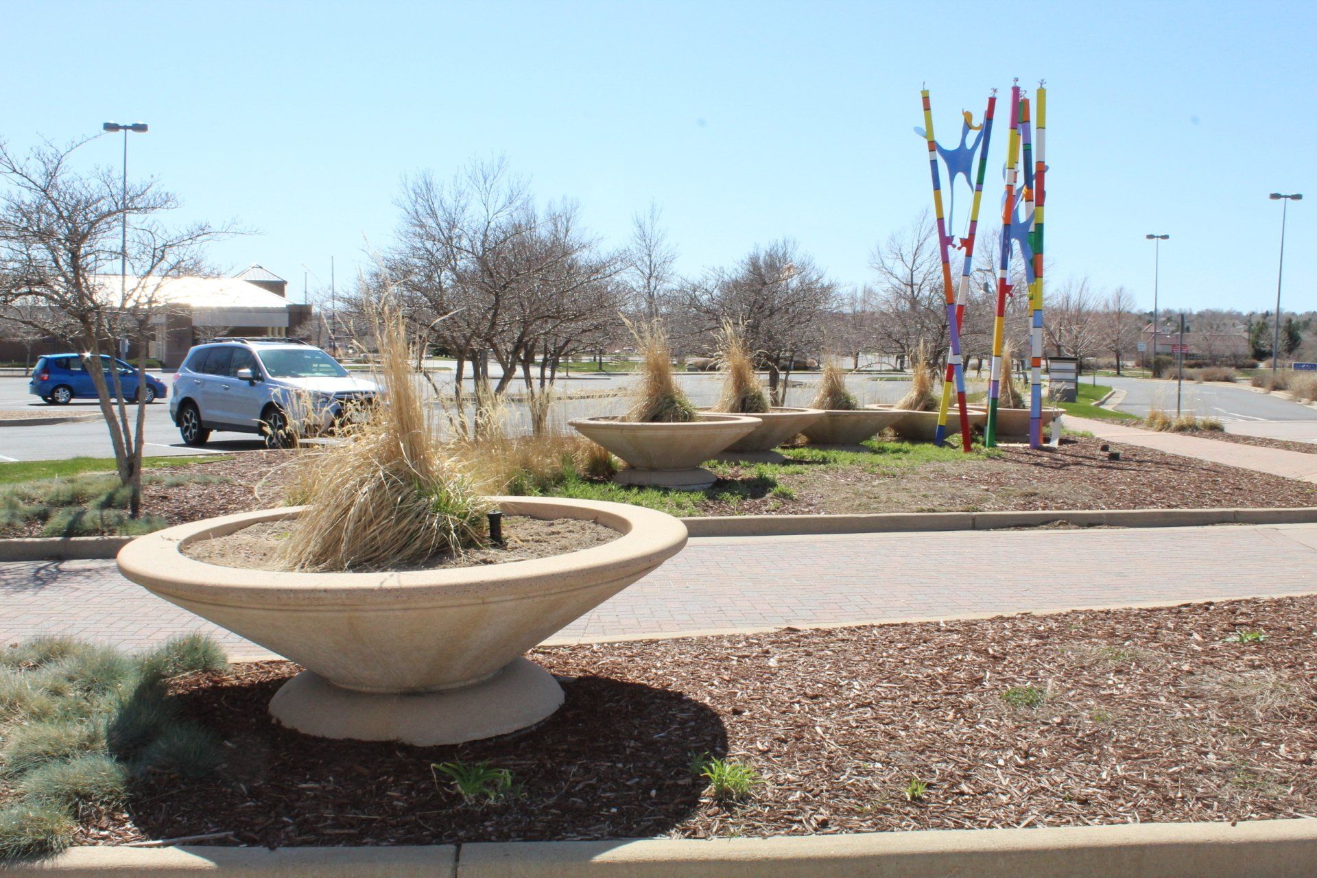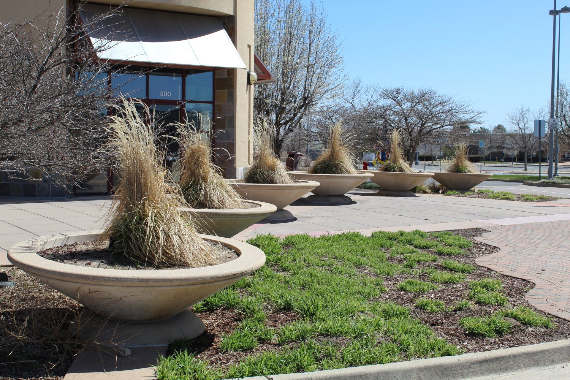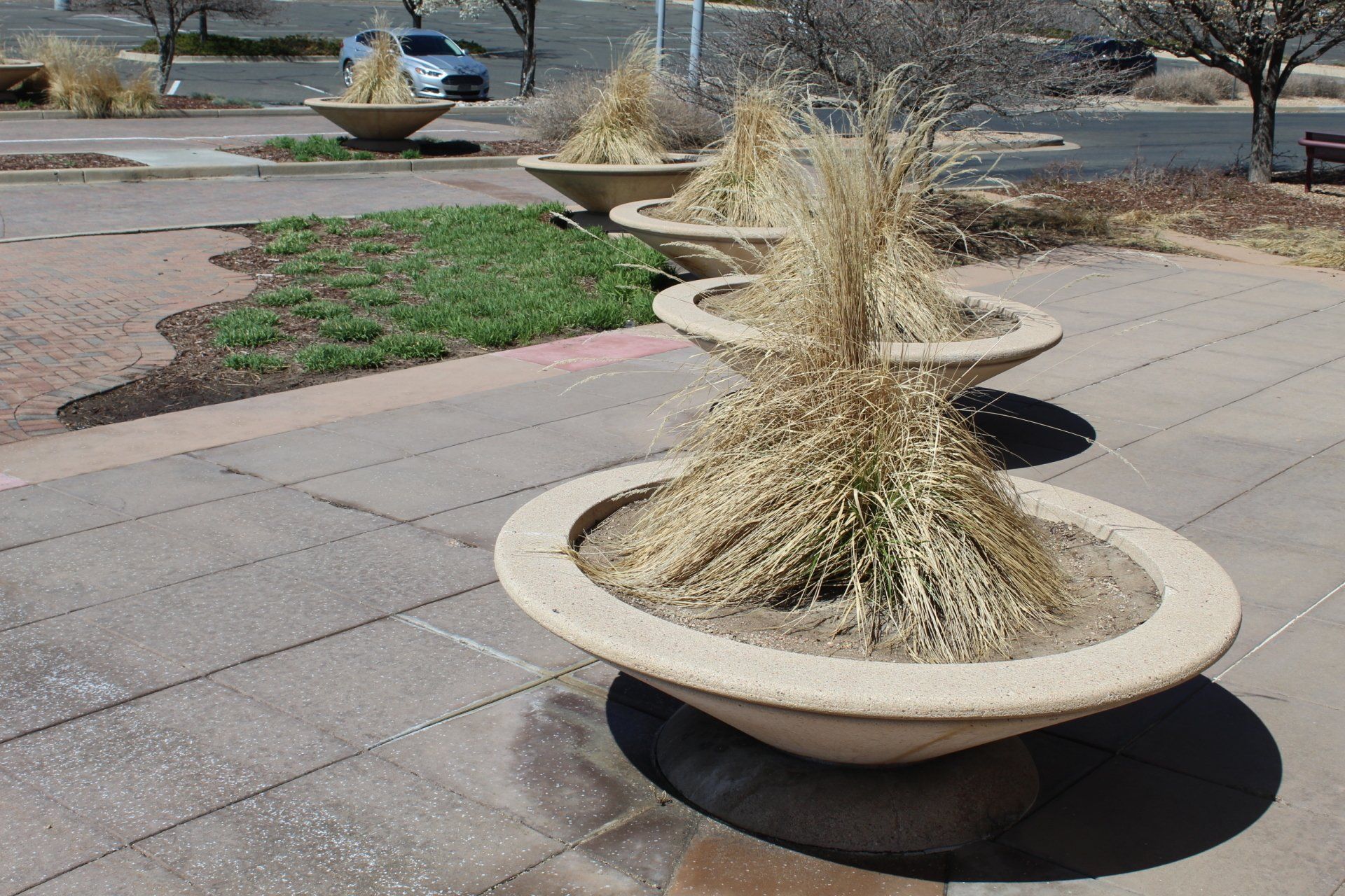 White acid etch planters that look like martini glasses. They are large and can help decorate a large area. They are definitely a nice addition to any open space.