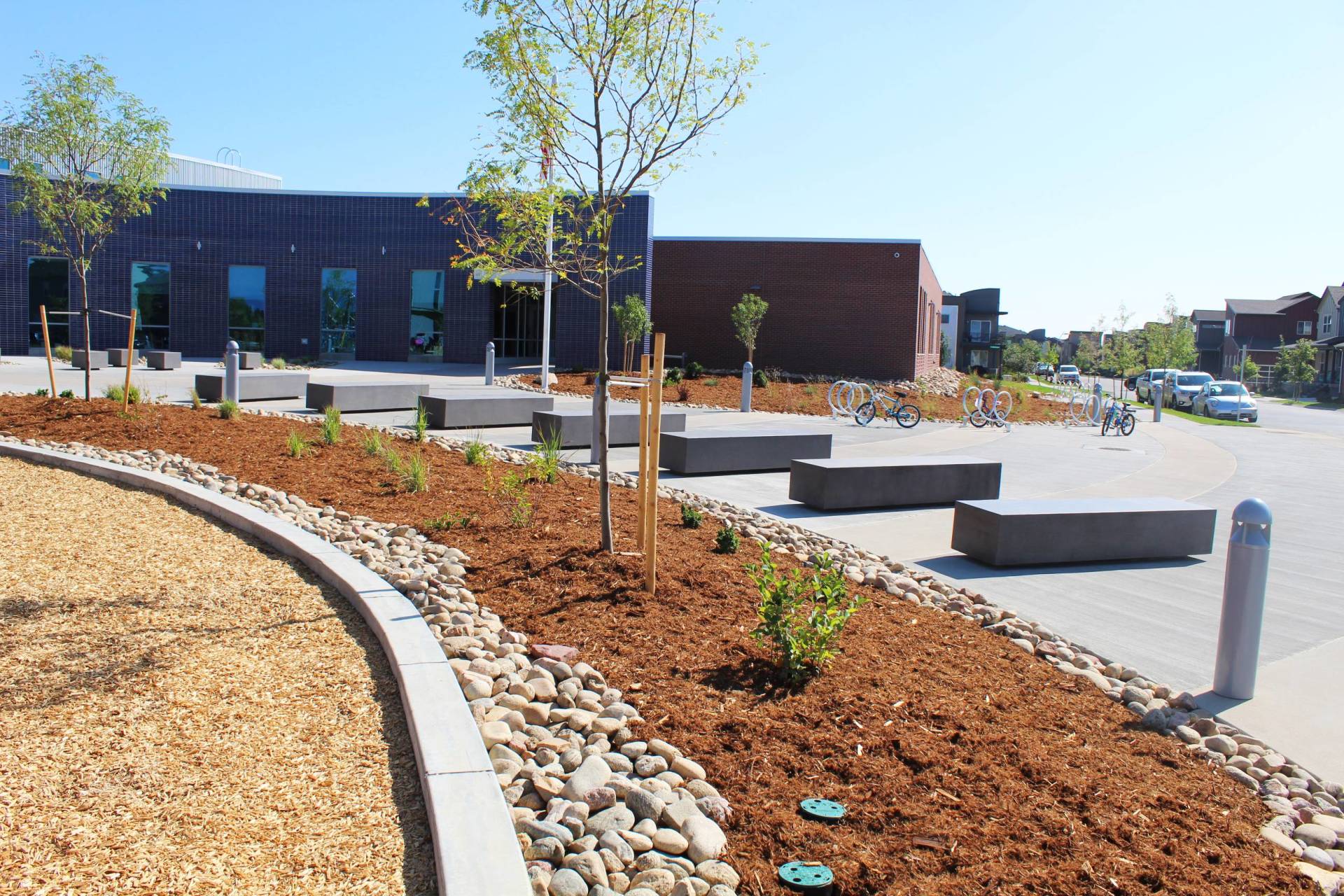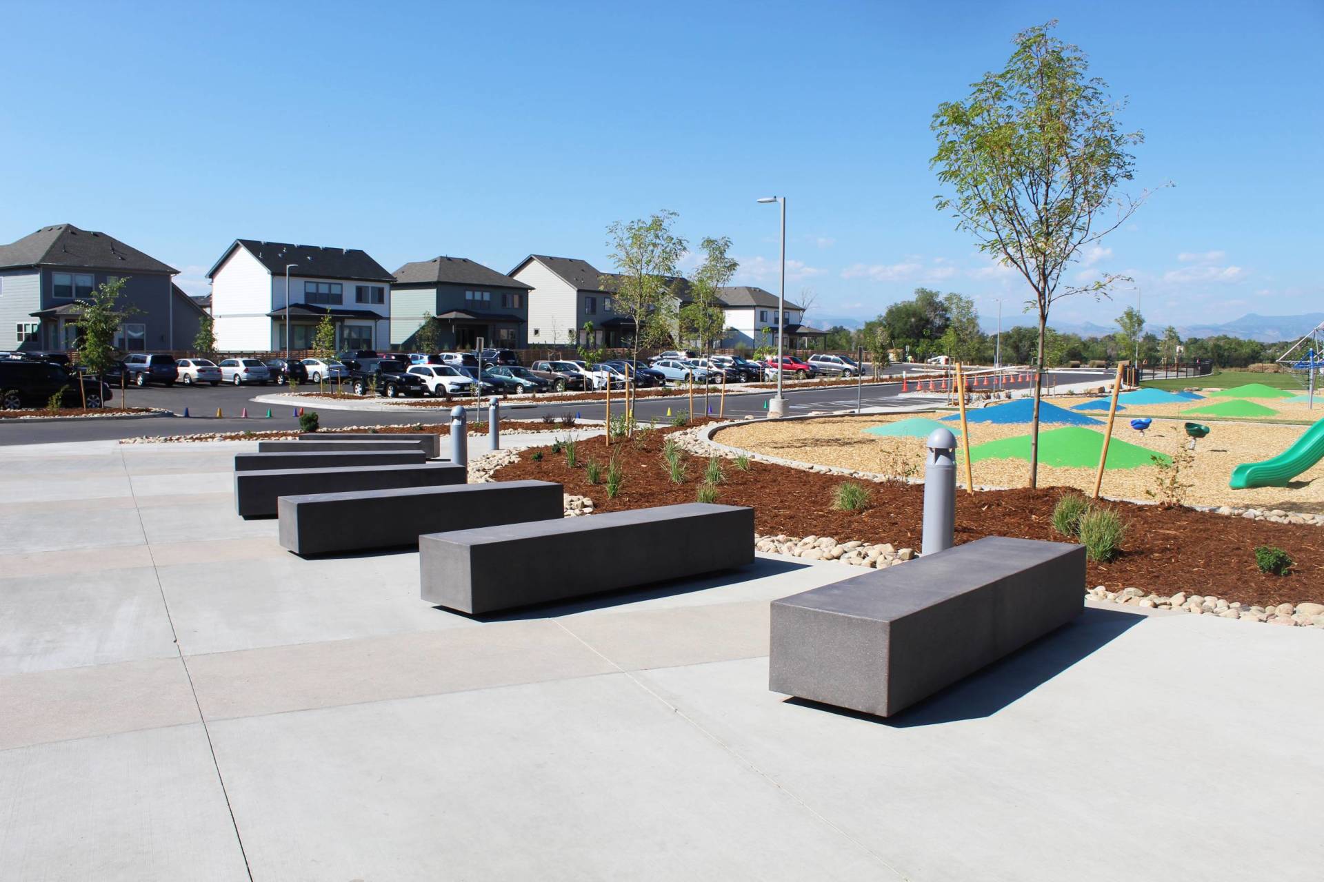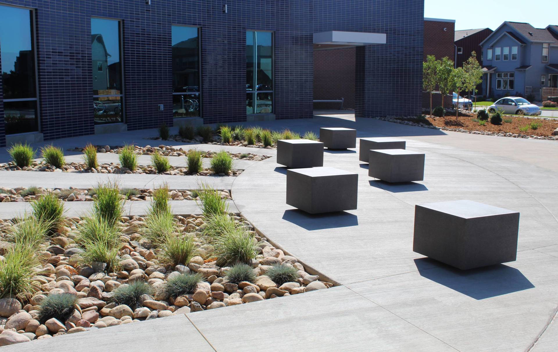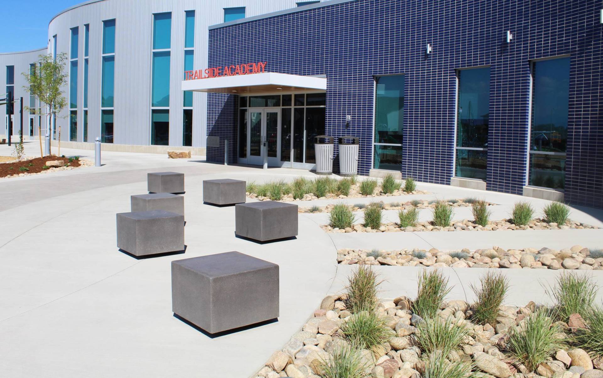 Precast floating cube seats and benches made for Trailside Academy. Modern and practical seating for a new elementary school.
